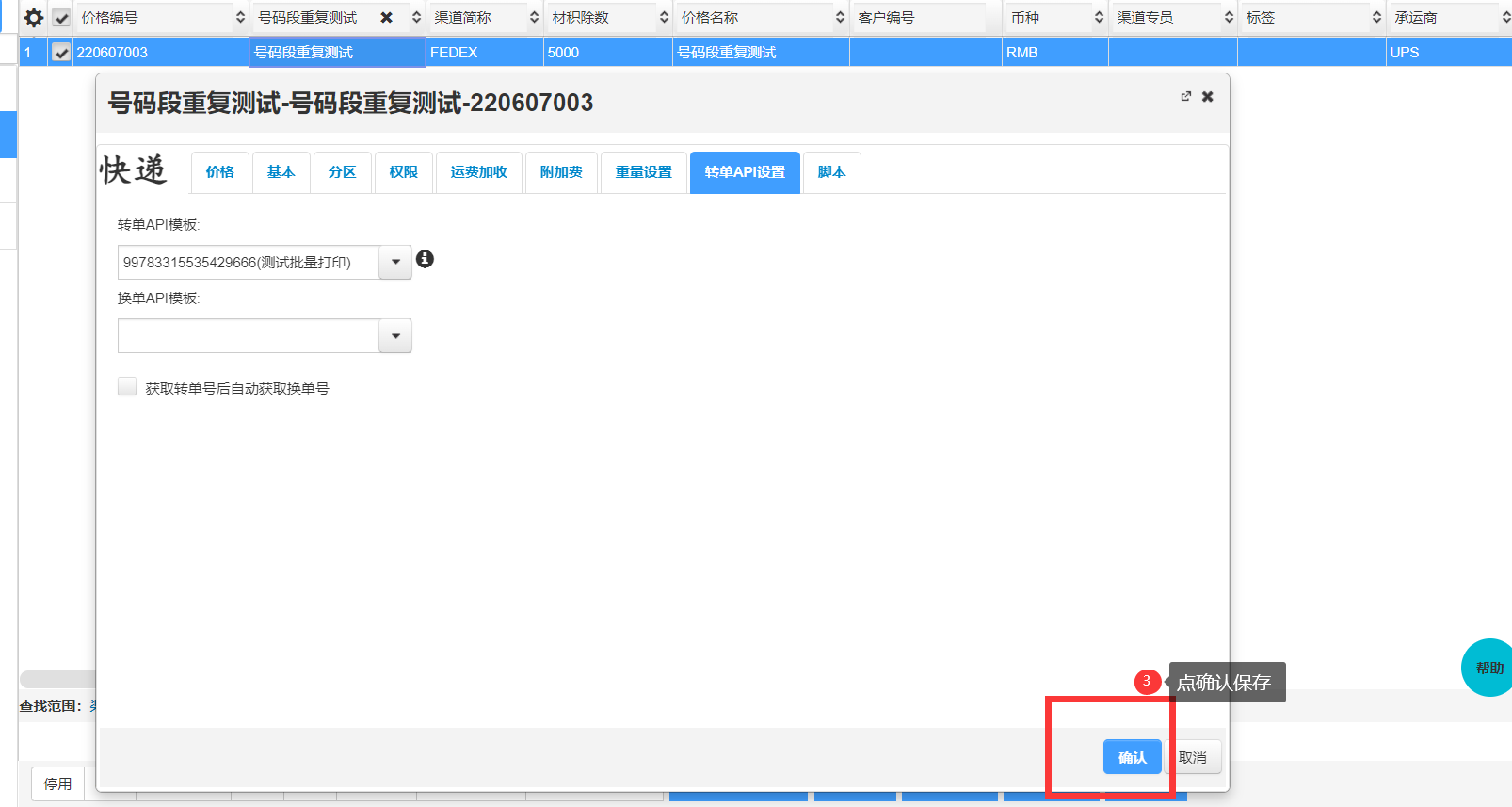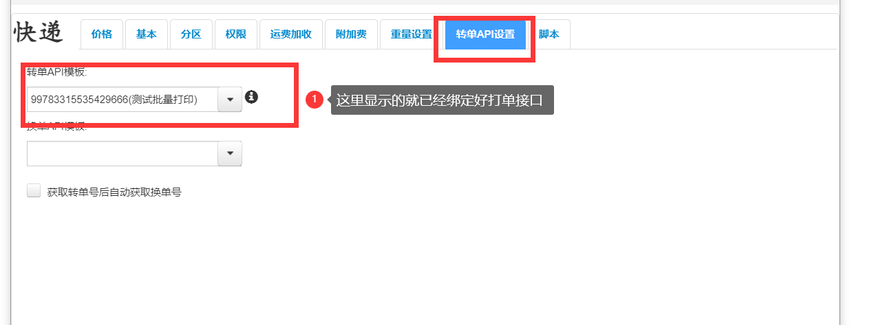 4、保存后打开看到转单API设置有转单API模板的就绑定好打单接口