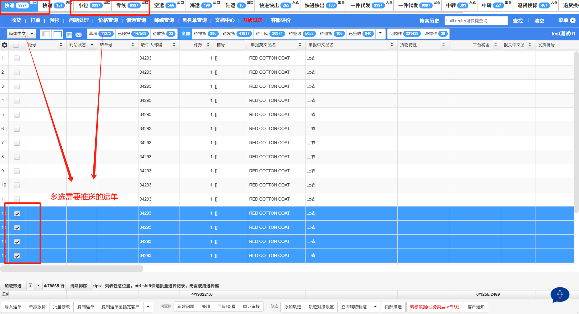 1、在快递/小包/专线业务选中需要订柜的运单