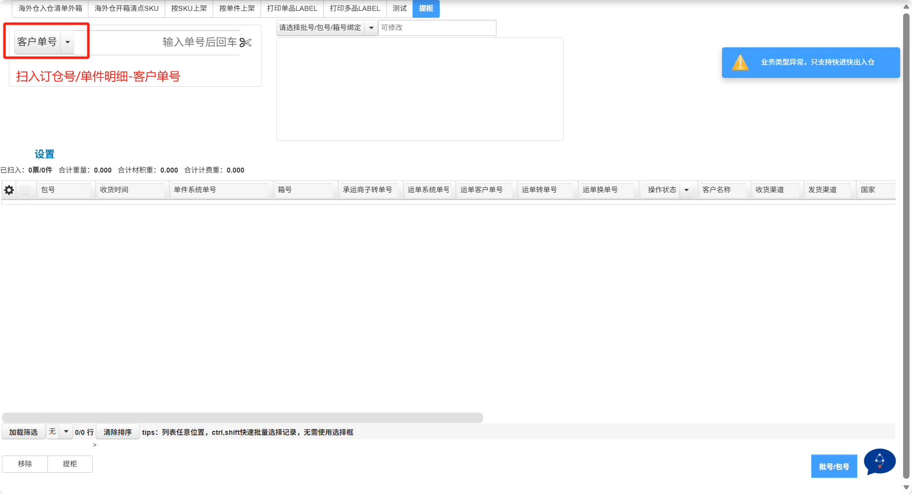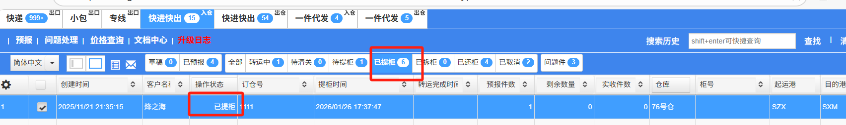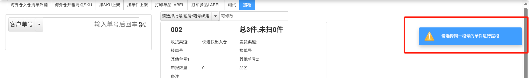 注意:单次操作提柜时,只能是同一订仓号才能操作,否则会进行拦截