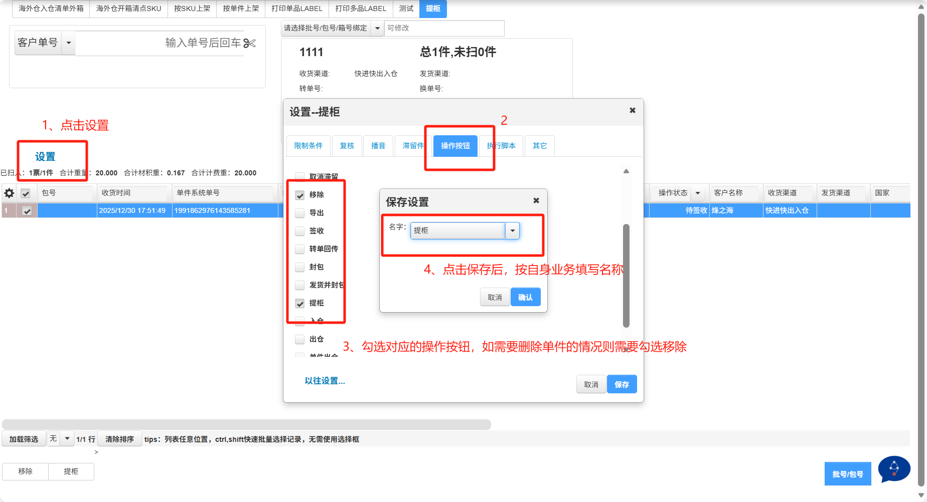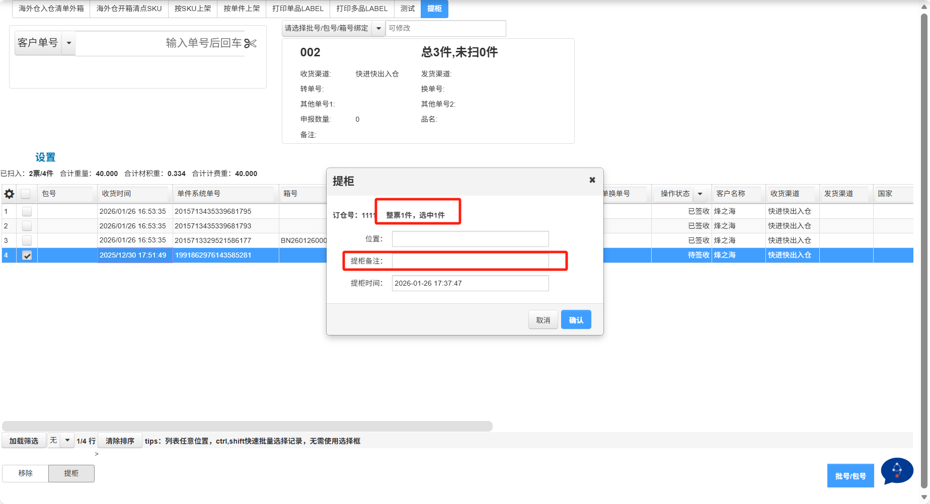 3、核对选中单件信息,填写提柜信息,点击确认则完成提柜
