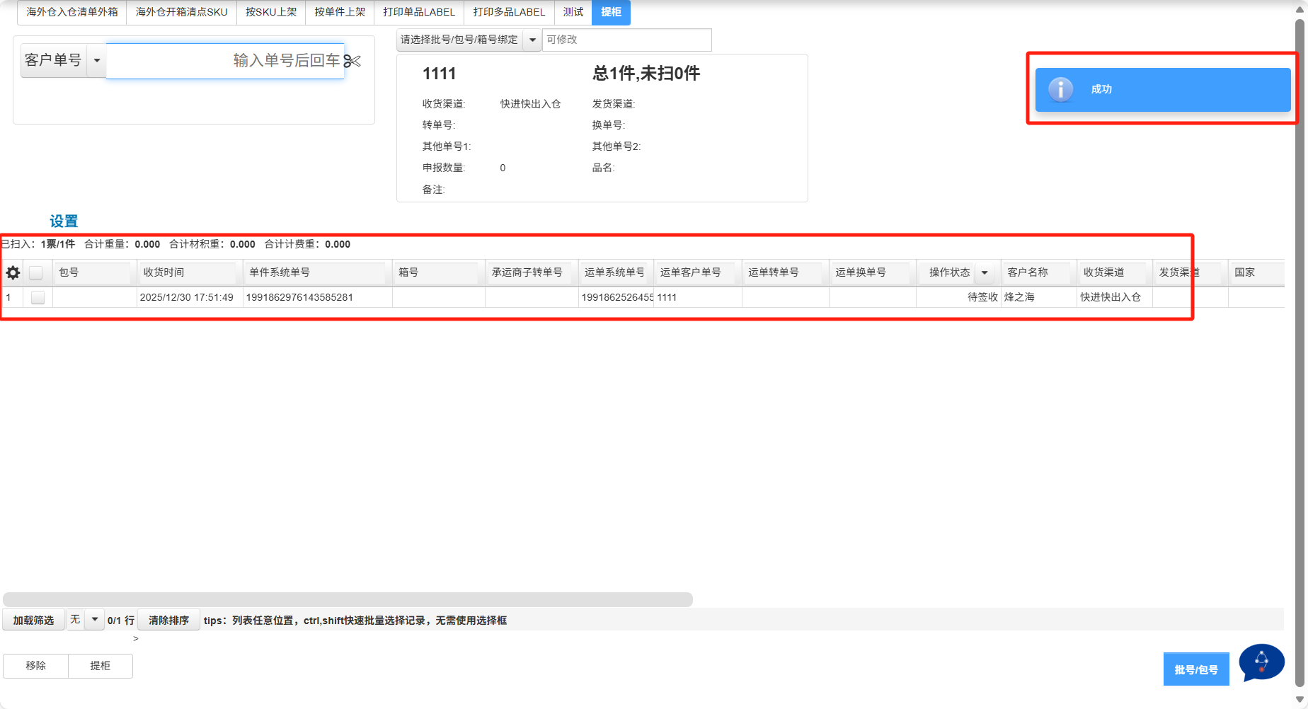 注意:提柜只能操作一次,请务必扫完同一柜号的所有单件后再操作提柜
