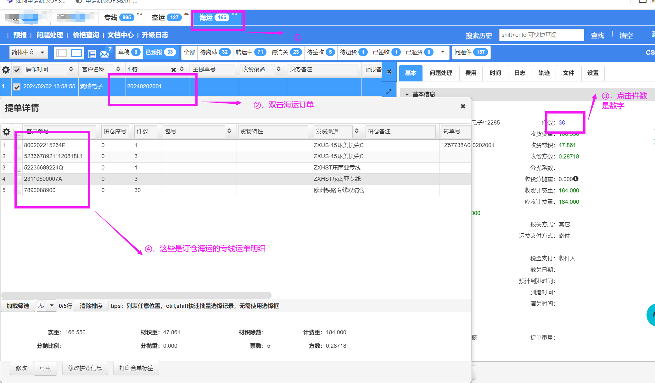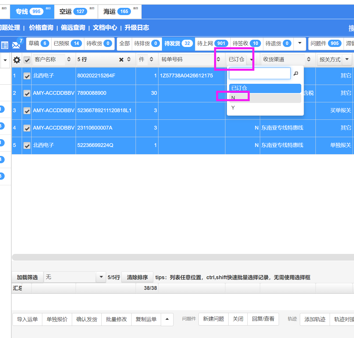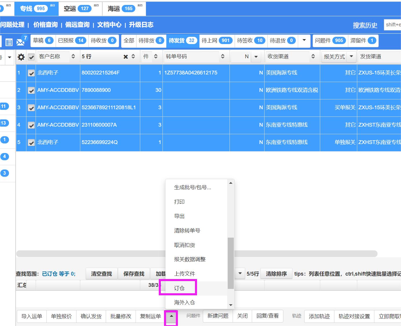 4、订仓完成后,订仓的N个专线单会打包成一票海运单到了海运的已预报界面