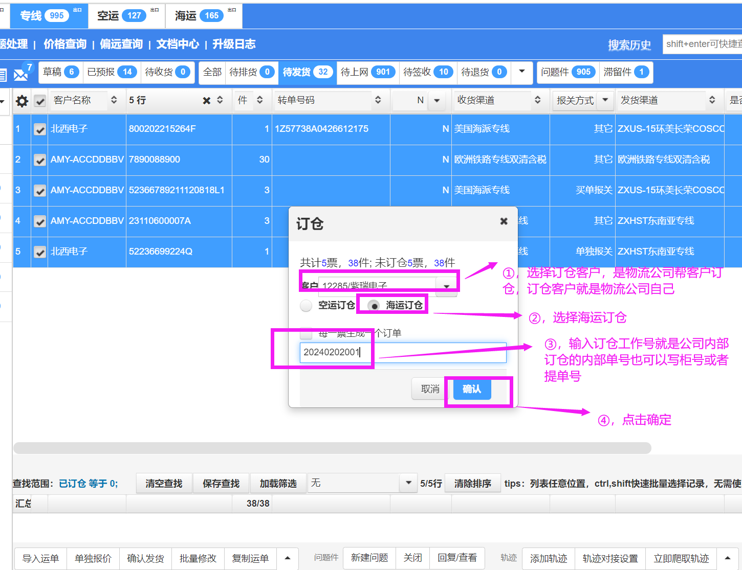 3、订仓界面选择订仓客户,选中海运订仓,输入订仓号(订仓号可以输入也可以设置系统自定生成)