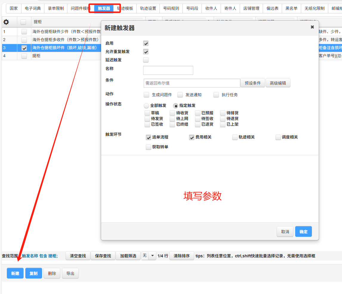 1、新建触发器,根据异常件的情况填写参数