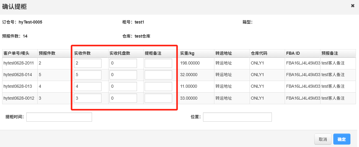 2、支持从码头 / 堆场 / 机场货运站核对件数后(待提柜状态),点击确认后完成入库暂存(已提柜状态)