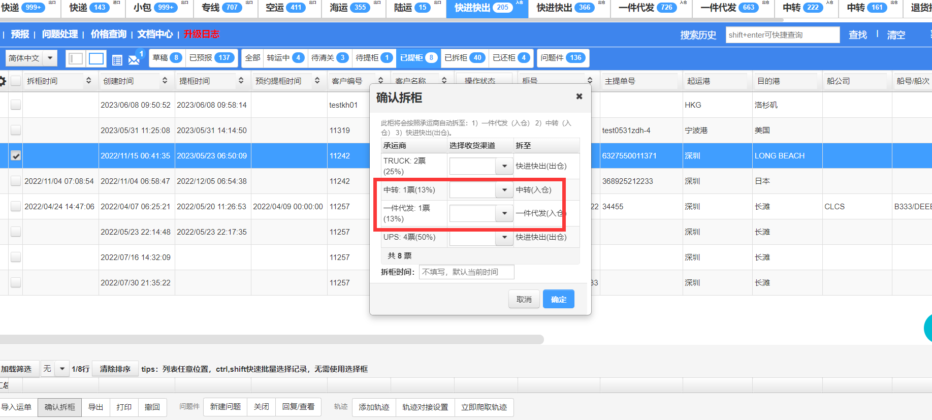 2.确认拆柜可以根据承运商拆到不同的业务
